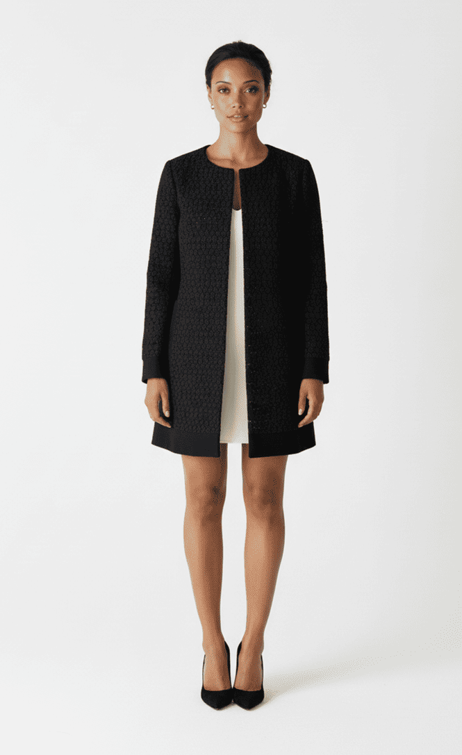 L’ensemble assorti : Pour les occasions spéciales, regardez nos robes noires taille 34. Une robe ajustée mettra parfaitement en valeur la coupe de ce manteau laine brodée.