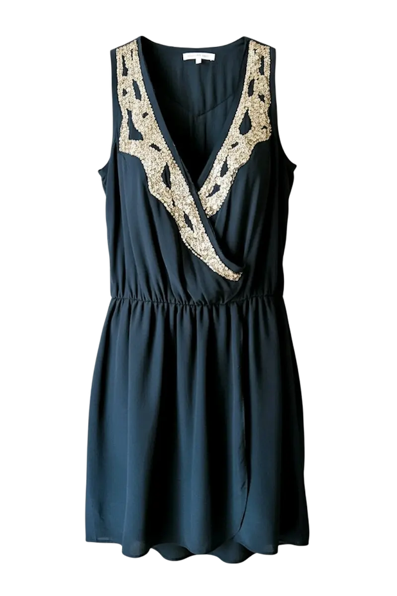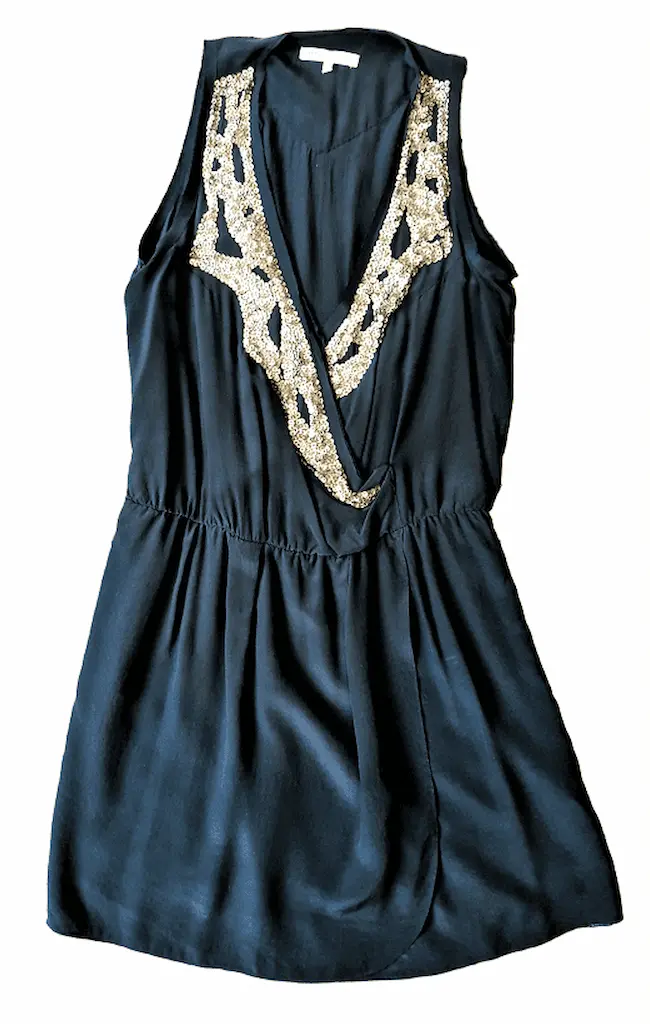 Le modèle Sandy a été lancé en 2010 sous l’impulsion de Judith Milgrom pour incarner le « glamour du soir » parisien. Produite à environ 4 000 exemplaires, cette robe est devenue une archive recherchée pour son mélange audacieux de soie vaporeuse et de sequins texturés inspirés de l’artisanat indien.