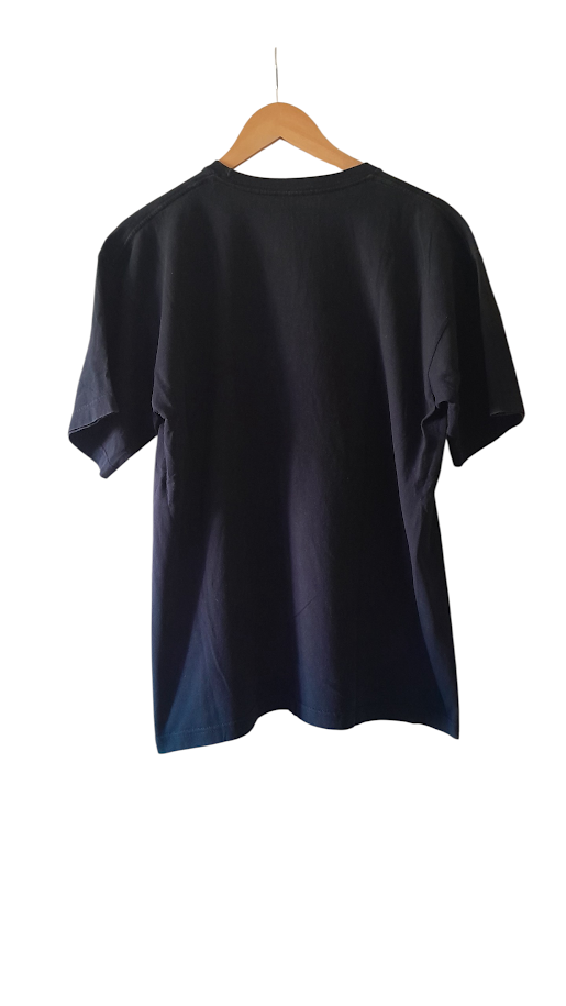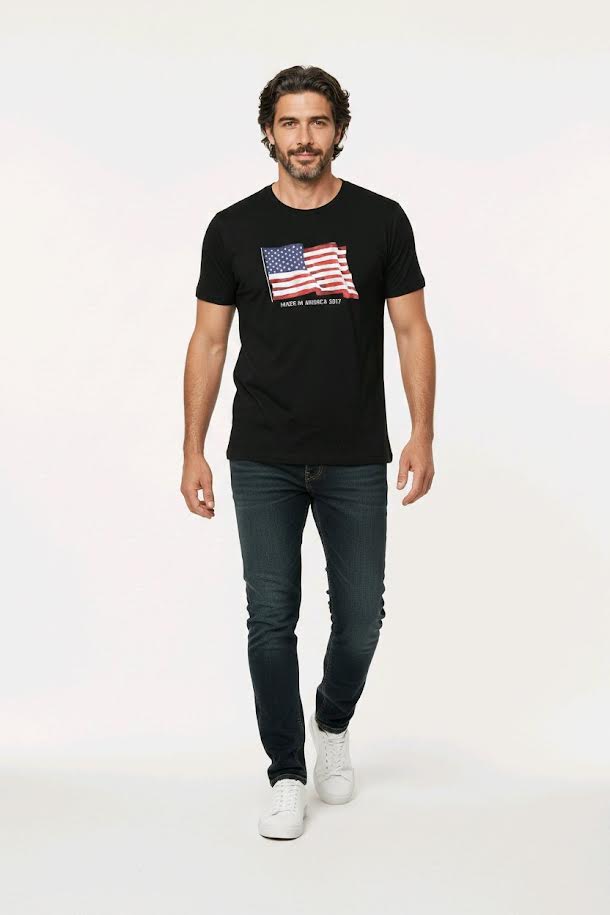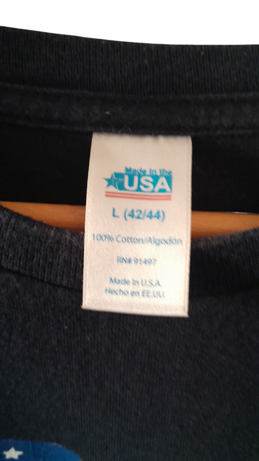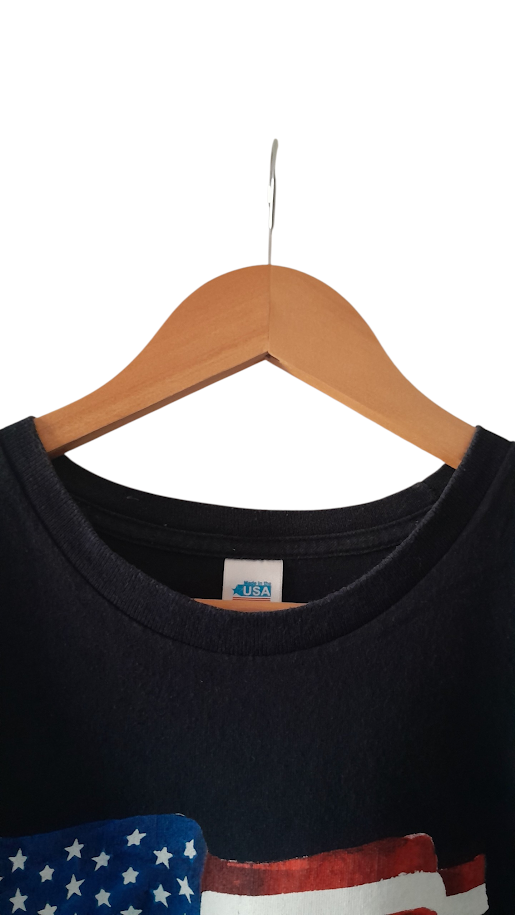 Ce T-shirt n’est pas une simple réproduction, c’est un morceau de l’histoire moderne du textile américain. Produit en 2017, il porte fièrement le slogan « Made in America », garantissant une fabrication locale sur le sol des États-Unis (comme le confirme l’étiquette « Made in the USA » avec l’étoile bleue). Le visuel du drapeau étoilé, traité avec un effet « brush » (pinceau) presque aquarelle, apporte une touche artistique et moins rigide que les imprimés classiques. C’est l’époque où le retour au « Made in USA » est devenu un véritable symbole de qualité et de fierté artisanale. Porter ce T-shirt, c’est revendiquer un héritage « workwear » et une mode durable qui traverse les années sans prendre une ride.