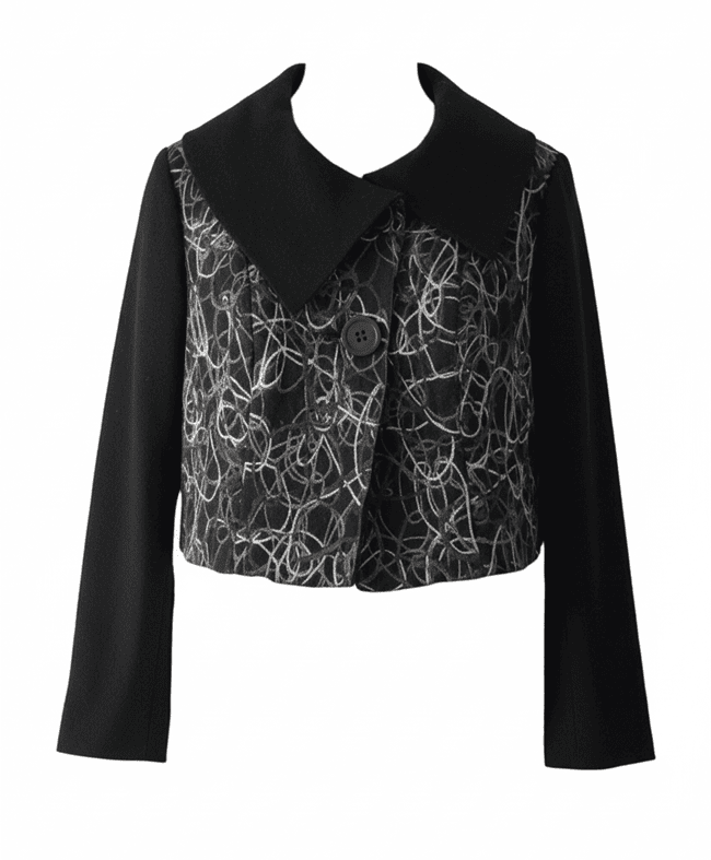 La couleur de la veste est noir avec des reliefs de fils blancs et bleus. C’est une pièce vraiment durable, pour plusieurs saisons. Intemporel et chic, elle s’associe facilement avec toutes vos tenues, des jeans aux robes habillées. La taille 2 correspond à un 38/40, une taille idéale pour de nombreuses femmes.