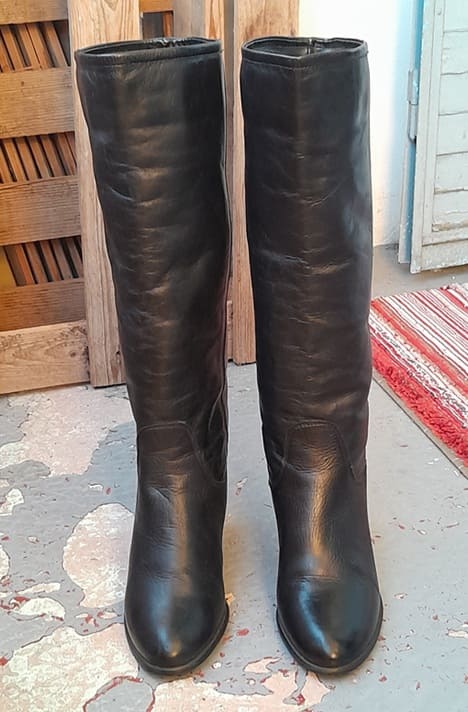 Cette paire, est un véritable trésor de la seconde main. Elle affiche un cuir lustré avec une très belle finesse, très bien conservé et très peu porté. Son atout majeur , sont ces talons style cowboy discret et must-have tendance. Qui vous propulse directement au cœur d’un style actuel et intemporelle, 2025 !